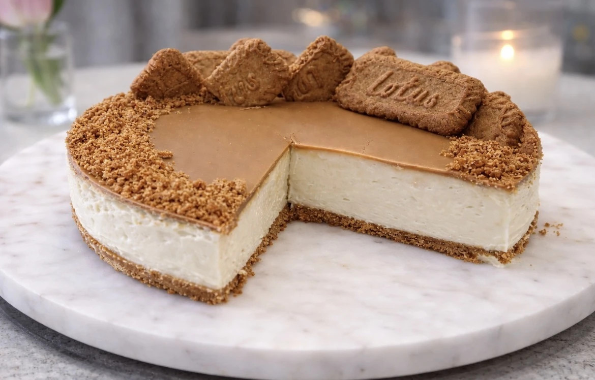En silkemyk og kremet ostekake med fyldig Lotus-smak og sprø kjeksbunn.