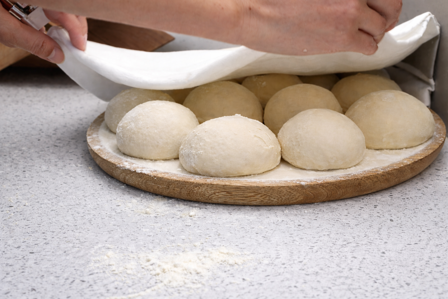 Fortsett til du har kjevlet ut 7–8 deiger (til ett bakebrett).