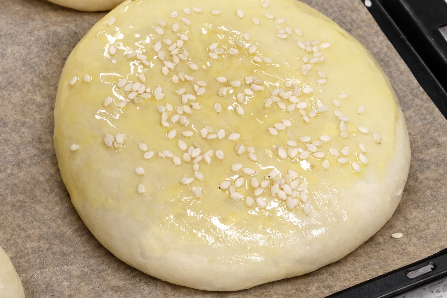 Pensle hamburgerbrødene forsiktig med sammenvispet egg. Dette gir en gyllen og blank overflate etter steking. Dryss deretter litt sesamfrø over brødene for ekstra smak og et klassisk hamburgerutseende.