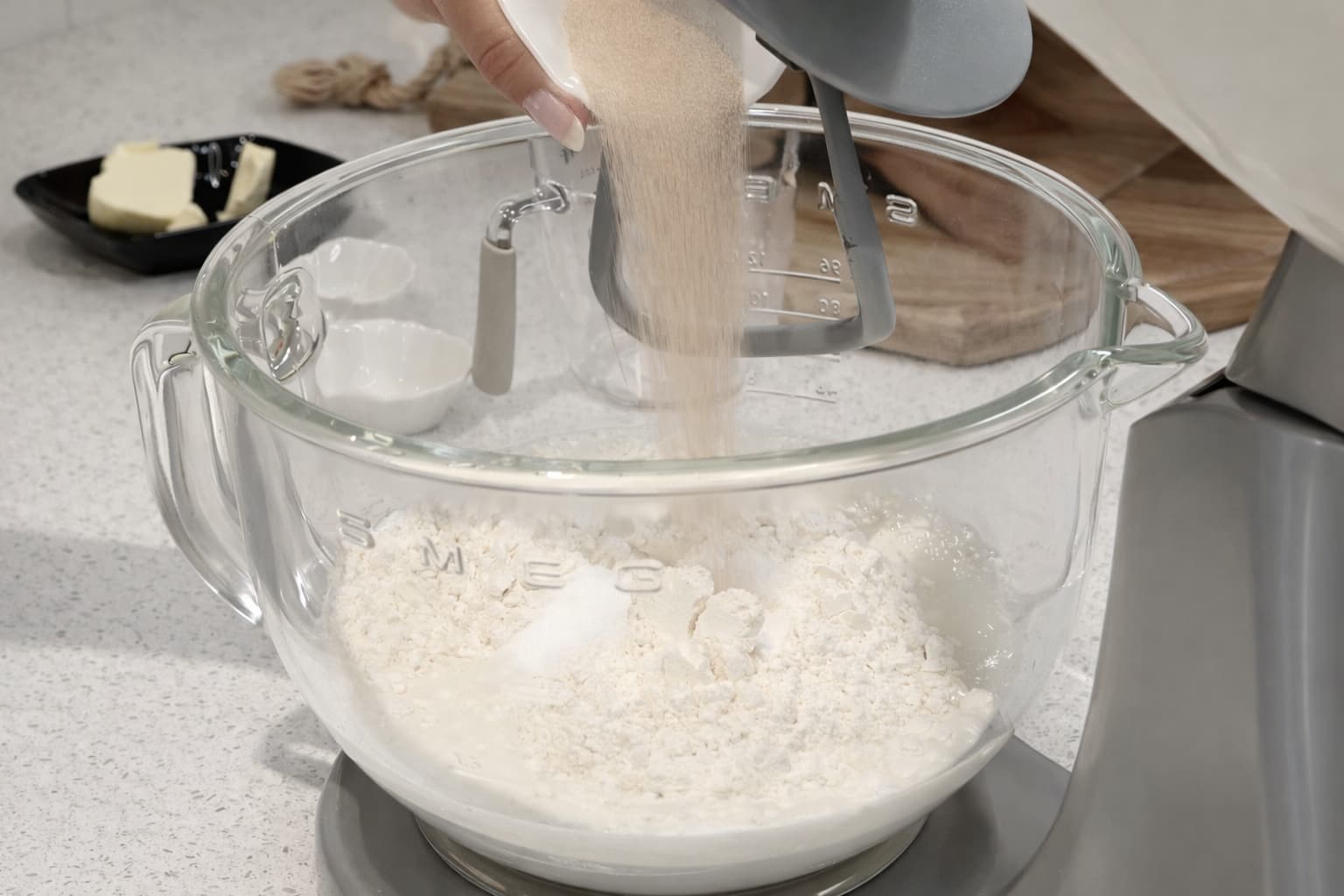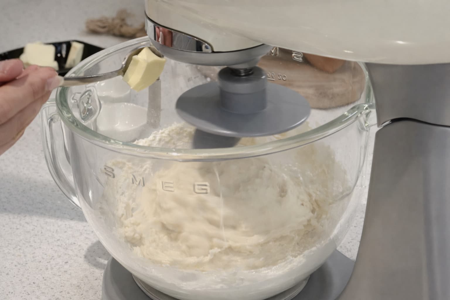 Når du har eltet deigen i 2 minutter, tilsett romtemperert smør og elt alt godt i 5 minutter til.