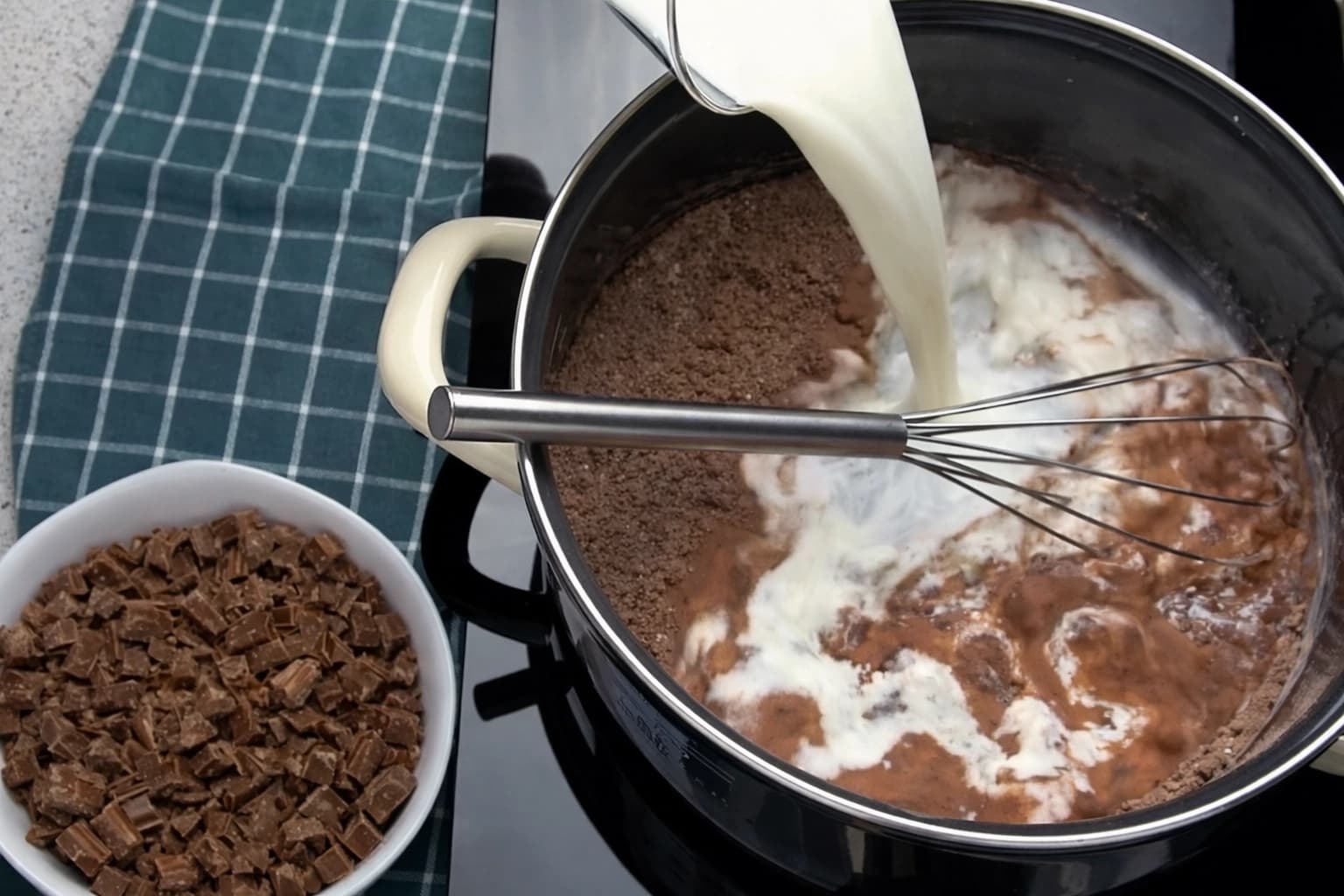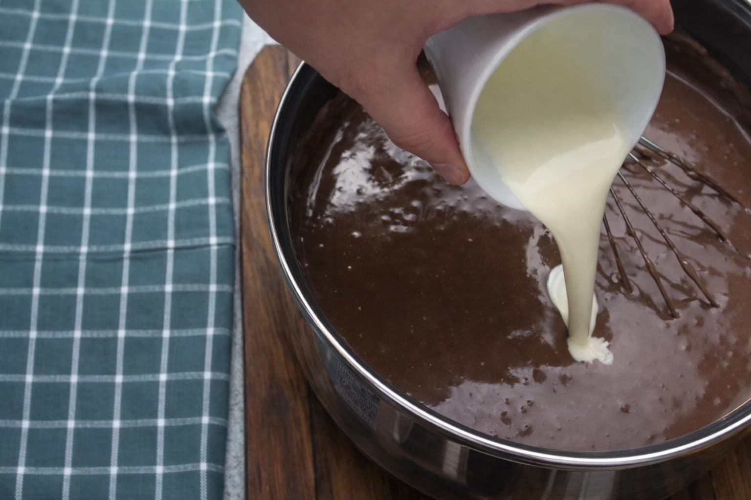 Hell i 1 liter kald melk og visp godt til maisennaen er helt oppløst og blandingen er uten klumper.