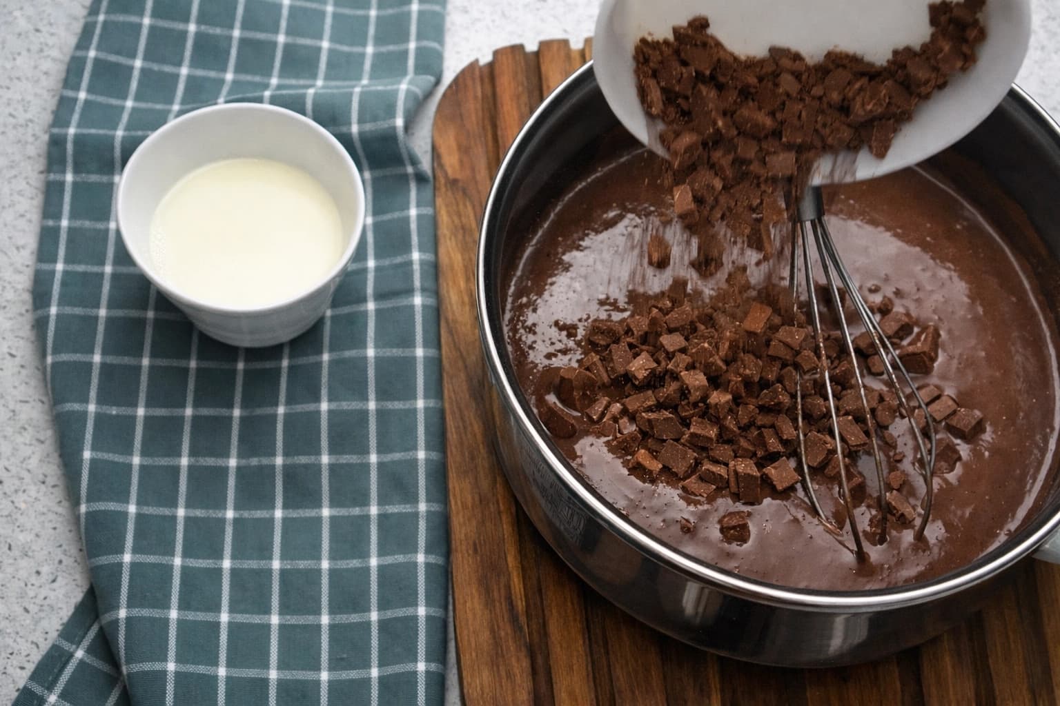 Tilsett den hakkede sjokoladen og la den smelte.