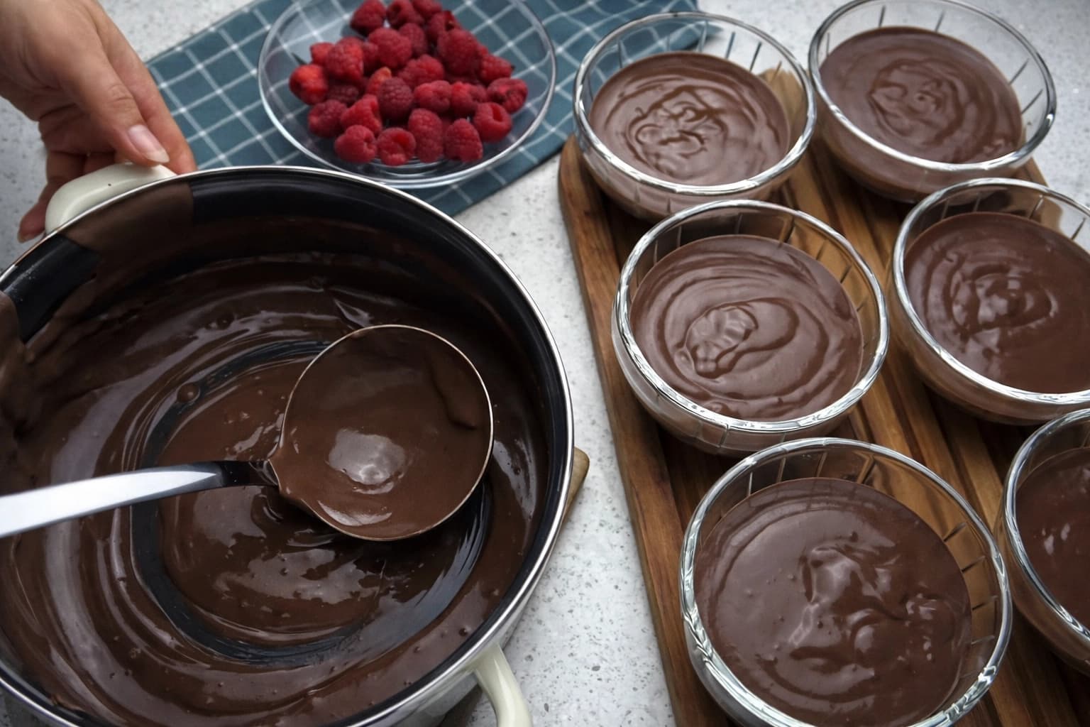 Fordel den varme puddingen i serveringsskåler.