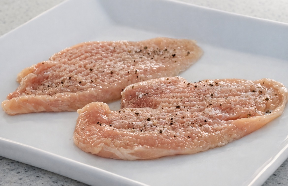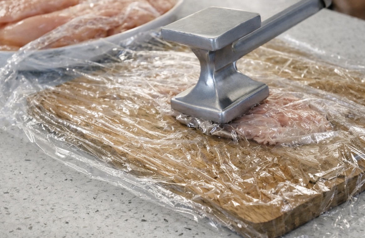 Legg filetene mellom plastfolie og bank dem flate med kjøtthammer.
