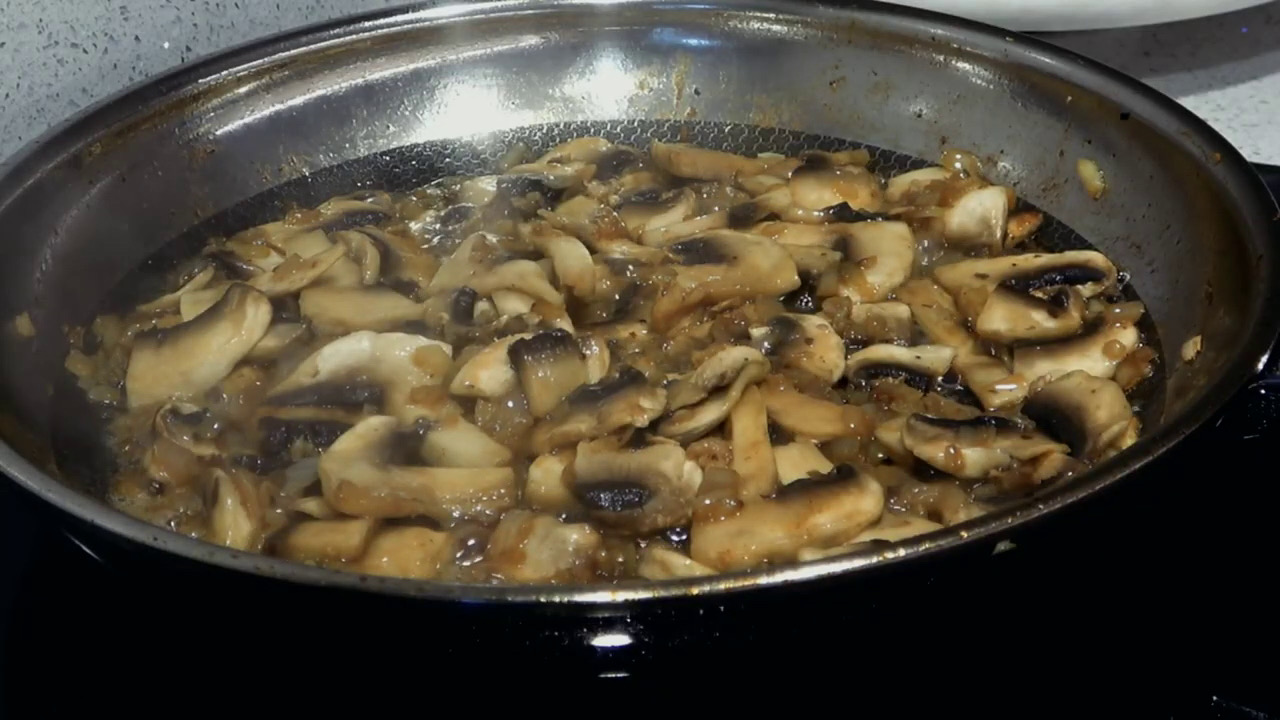 Når soppen har fått litt farge, tilsett tomatpuré og rør godt.