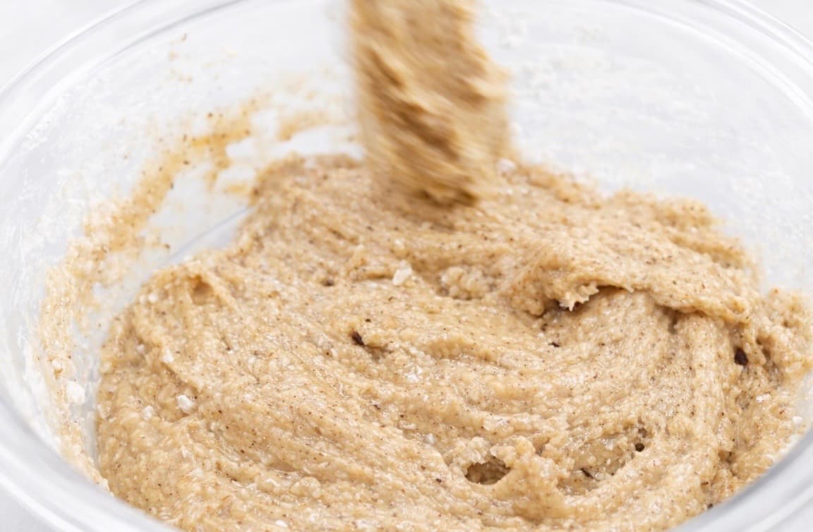 3. Bland inn hvetemel, bakepulver, kanel, natron og salt, og rør forsiktig til en jevn røre.