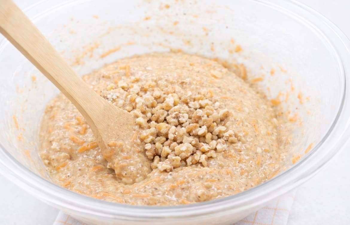 4. Rør inn revet gulrot og hakkede valnøtter, og bland forsiktig til alt er jevnt fordelt.