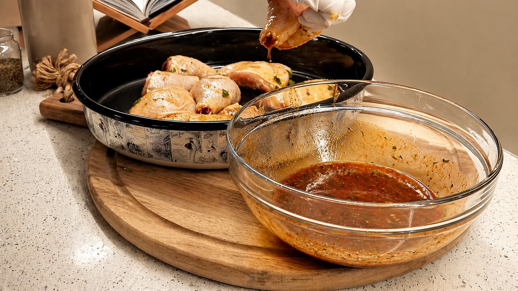 2. Vend kyllinglårene i marinaden, ett og ett, til de er jevnt dekket, og legg dem i en ildfast form.