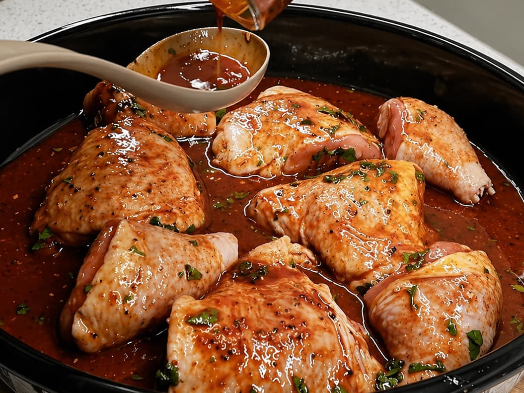 3. Hell resten av marinaden over kyllinglårene i formen.