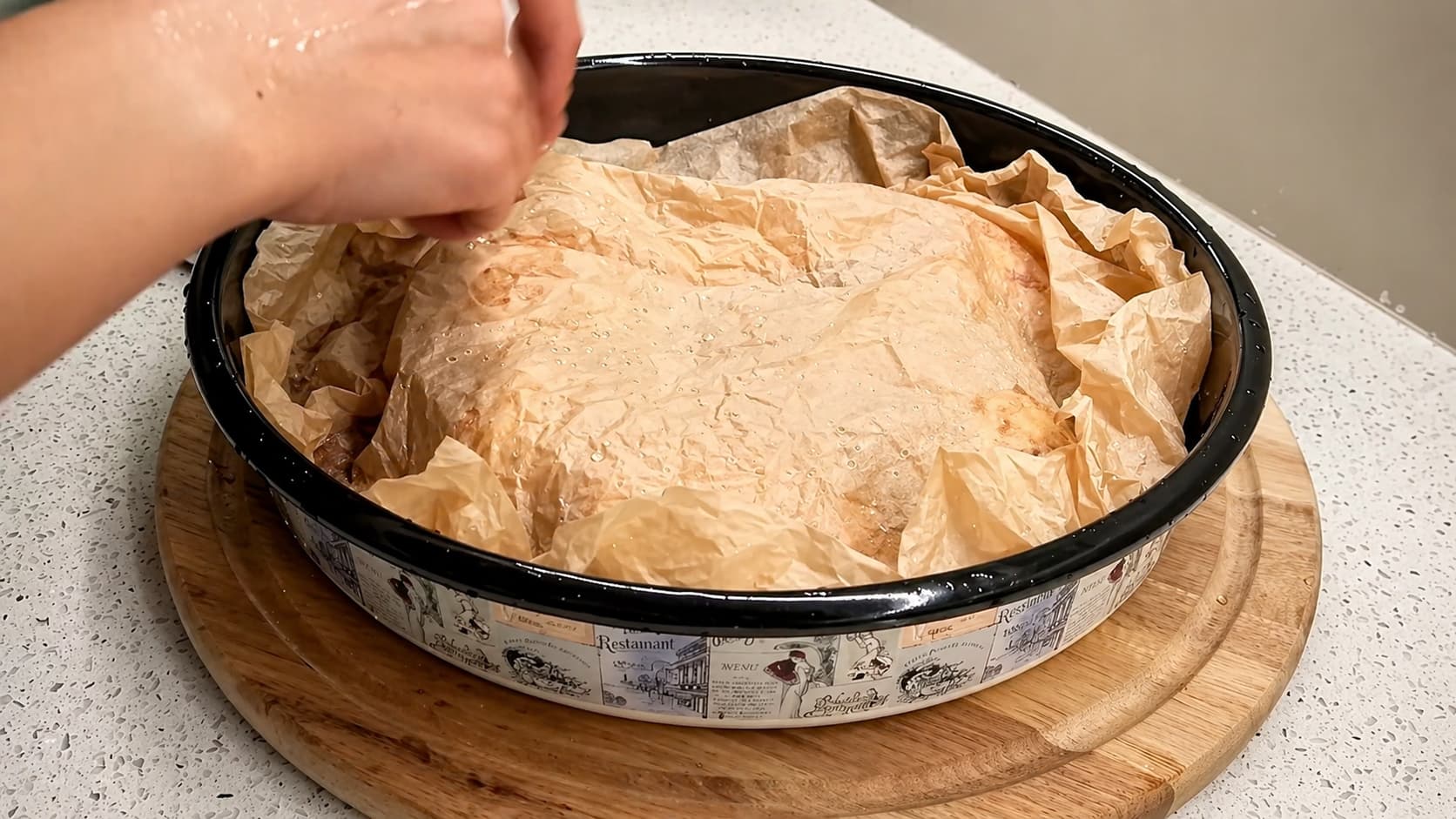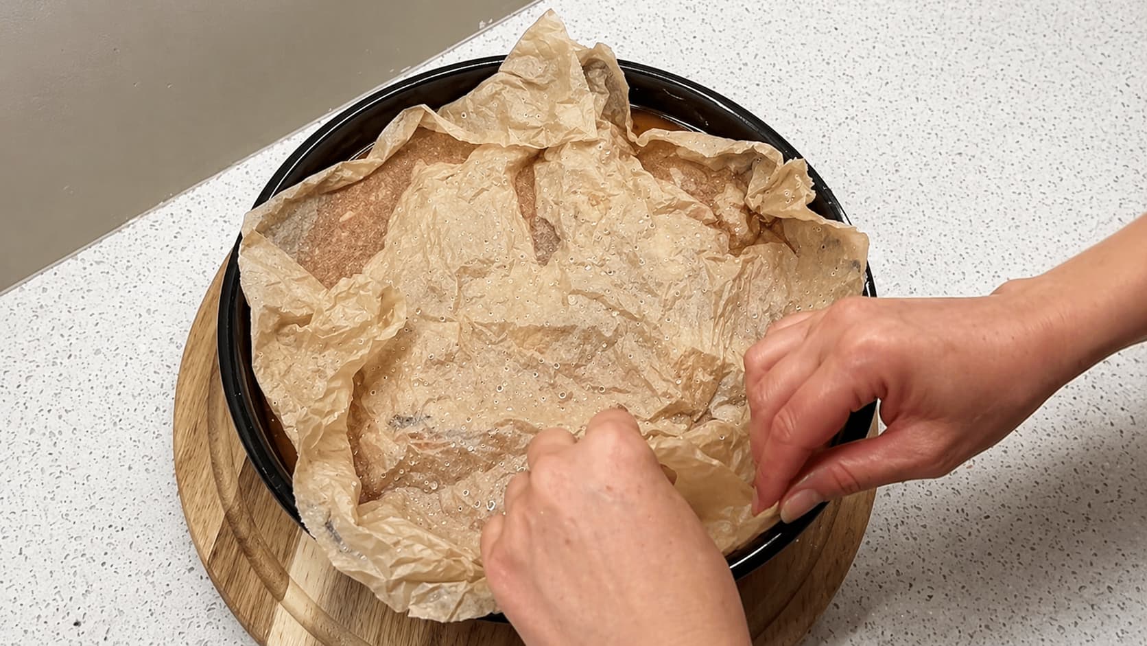 10. Dekk formen igjen med fuktet bakepapir, og stek videre i ovnen på 220 °C i ca. 30 minutter.