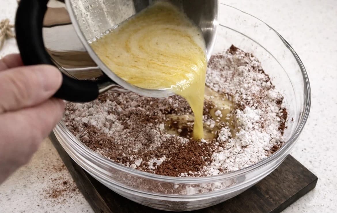Tilsett vann og kakaopulver, og rør godt til kakaopulveret er helt oppløst og blandingen er jevn.